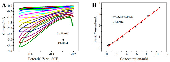The detection of H2O2 using CVs based on the direct electrochemical reduction of H2O2 on 3D Au-rGO/FTO was performed (Figure 12A). As Figure 12B describes, the linear regression equations were expressed as Ipa = 0.331 C + 0.0675, R2 = 0.994 (C = 0.179–10.5 mM). The detection limit was found to be 0.0196 mM (S/N = 3) and the sensitivity was 236 μA mM−1 cm−2.