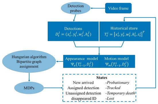 The proposed tracking scheme consisted of detecting targets and matching their identities frame by frame, which led to a set of target trajectories over time. The tracking-by-detection method was used to address this problem. Figure 1 shows the overview of the proposed multiple-vehicle tracking framework. The detection probes produced simultaneous current results, and the tracker guaranteed long-term tracking. New detections were linked to the activated tracks at each time step by solving the linear assignment problem. The motion and appearance model were integrated to create a pairwise matching score matrix, where traditional methods and deep learning were both involved. The initialized targets and the new detections were gathered in a bipartite graph, and the Hungarian algorithm was used to find the optimal assignments that maximized the total matching score. Finally, to realize stable tracking, each object was initialized with its own MDP that could manage lifetime based on real-time state transition. Moreover, it relied on online reinforcement learning to learn a policy for data association between training tracks and ground truth.