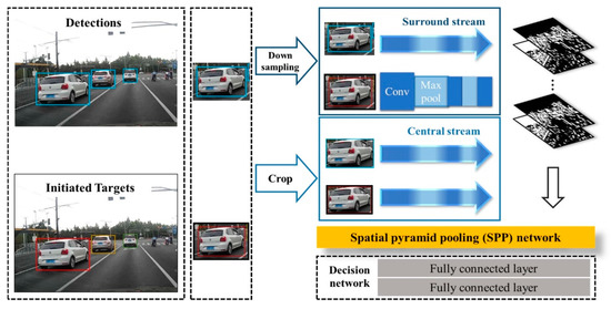 To calculate similarity in the two-channel network, the patches of each target were cropped to ( by experimental experience. Surrounding context features could enhance comparability, and large expansion may not only increase computation but also decrease accuracy. These patches go through down-sampling or cropping processes, and they are then transferred into the surrounding and central steams, respectively. Down-sampled patches in the surrounding low-resolution stream match the surrounding context features when the targets have a similar appearance. High-resolution patches in the central stream supplied more details about vehicle features. Two streams were designed to extract discriminative features, where the pixels of the vehicle and the periphery were all taken into consideration.
