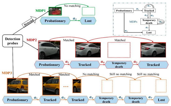 The state space in the target MDP was parted into four subspaces, where each state encoded the global information of the target depending on feature representation, such as location, size, and appearance. Firstly, each object caught by the detector was activated to enter the “probationary” state. Vehicles in this state could transition to the “tracked” state only if they matched in the consecutive frames. Otherwise, the false alarm triggered entry to the “lost” state and removed the historical data. A tracked target could stay “tracked”, or transition into “temporary death” if the vehicle was lost due to occlusion by other vehicles, acceleration, or being out of view. Likewise, vehicles in the “temporary death” state had the chance to get back to “tracked” if it could complete successful matching, otherwise it transitioned to the “lost” state forever. Seven possible transitions were designed between the states of a target, which corresponded to seven actions in MDP.