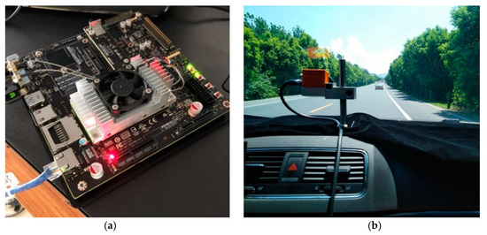 (a) NVIDIA Jetson TX2 with 256 GPU cores; (b) Comprehensive tests are validated in the moving vehicle in different scenes (e.g., highway).