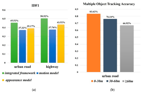 In terms of using the track method in the domains of intelligent vehicles to increase safety, the distance between the ego-vehicle and other objects is worth taking into account. Three distance thresholds were observed and analyzed in an urban road environment. The threshold selection depended on the image size in this test phase. As shown in the right histogram of Figure 5b, the multiple object tracking accuracy (MOTA) performed better when the targets were closer, in which they were highly threatened.