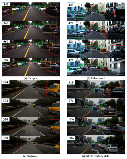 To evaluate the performance of the proposed multi-vehicle tracking method, extensive experiments were conducted on the KITTI Vision Benchmark Suite dataset [38], which is the widely used benchmark for multiple vehicle tracking. The training dataset consisted of 21 sequences with 8008 frames, and the testing dataset consisted of 29 sequences with 11,095 frames. Despite the dataset having labeled eight different classes, only the class “car” was considered in our work. Especially, the KITTI dataset provided object detection as well as tracking results in a full-face perspective based on its comprehensive annotations. It was crucial to the research of tracking by detection with a frontal, onboard monotonous camera. In the self-collected datasets, 50 annotated sequences of three typical traffic scenes in various light conditions were acquired from a moving camera with 480 × 640 pixels. All sequences had a varying number of objects and lengths with unique motion scenarios. The differences of size and orientation, occlusion pattern, and illumination were considered in our datasets.
