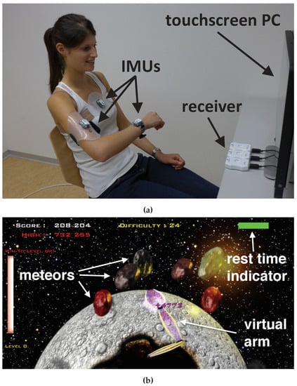 (a) ArmeoSenso system setup, which uses the proposed Inertial Measurement Units (IMU)-based arm tracking method (Rest Pose Magnetometer-based drift Correction (RPMC)), demonstrated by a healthy user. The receiver doubles as a battery charger for the IMUs and also guarantees the correct initial position for the calibration. (b) Screenshot of the Meteors therapy game [,], played by the experimenter during the optical validation. The purple virtual arm follows the user’s arm movement and is used to catch the meteors falling from the top of the screen. The horizontal green bar at the top right corner indicates the remaining time until the user has to assume a rest pose. Once the system recognizes the rest pose, the game is paused and the magnetometers in each sensor are used to correct accumulated drift.