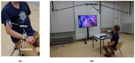 Tracking arm movements of a user seated in front of a computer has applications in virtual reality (VR) based gaming, e.g., for the purpose of entertainment or physiotherapy [,,,]. A popular method to track arm movements relies on body worn Inertial Measurement Units (IMUs), due to the low hardware cost, low latency, and no need for a line-of-sight [,]. Off-the-shelf IMUs are available with integrated 3D accelerometers, gyroscopes, and magnetometers. Commonly, one IMU is fixed on each body segment of interest [,,,,] and the orientation of the IMUs relative to the body segments is calibrated in a defined user pose, e.g., a T-pose []. The IMUs can then track the orientation of each body segment and joint positions can be obtained from forward kinematics [,]. The IMU orientation is usually obtained by integrating the angular velocity measured with the gyroscope [,,,,,,]. This allows for immediate detection of orientation changes but leads to a drift of the estimated orientation over time, e.g., due to gyroscope bias []. Drift relative to the direction of gravity can be corrected with measurements from the accelerometer, assuming that, in the long term, gravitational acceleration dominates over translational acceleration from the subject’s movement [,].