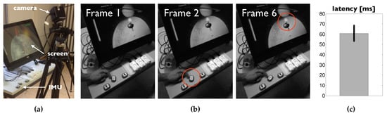 (a) Camera setup, screen, and IMU sensor used for latency estimation. (b) Example of key frames used for a single latency estimation. At Frame 1 the sensor has not yet moved, at Frame 2 the first displacement of the sensor can be visually detected, and at Frame 6 the first displacement of the virtual arm on the screen can be visually detected, resulting in an estimated latency of . (c) Mean and standard deviation of the resulting latencies ().