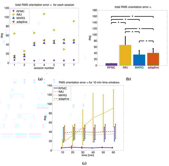 A summary of the results from the orientation estimation validation can be found in Table 3. For the proposed RPMC method, the average RMS error for the recorded, 1 long sessions (Figure 5a) was and significantly lower (Wilcoxon signed-rank test, for all three tests, Figure 5a,b) than for the three methods used for comparison with , and . That is, the RPMC method led to an error reduction of , , and , respectively.