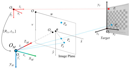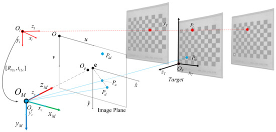 In many studies, it is usually assumed that the distortion center and the main point are in the same position, but Hartley [28] determined experimentally that there is a certain deviation between them. During the calibration process, we use a checkerboard as the calibration object, and extract the corners of the checkerboard as the control points for camera calibration. Since the corners are distributed on a plane, we set the in the target coordinate system, in which case the imaging model can be expressed as: