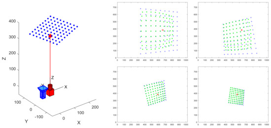 For Equation (19) and the combined Equation (17), two equations can be obtained for each pair of corner points. When the number of corresponding points (where n denotes the number of distortion parameters), an overdetermined equation is obtained. This can be achieved by moving the target, as shown in Figure 2. The homography matrix and the distortion coefficients can be obtained by using the least square method.