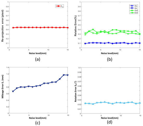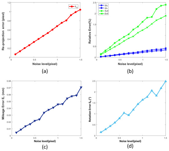 Simulation results for different image noise levels. (a) The re-projection error ; (b) The effects of noise on intrinsic parameters such as , , , ; (c) mileage error for different noise levels; (d) effects of noise on rotation error .