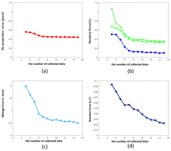 In addition, we analyzed the impact of the number of collected data on the calibration accuracy, and set the calibration data to gradually increase from the minimum of three groups of image distance data to 15 groups. The results are shown in the Figure 5. With the increase of calibration data, the re-projection error remains almost stable, but the accuracy of the estimated system variables is significantly improved. When the number of data increases to 8, the decline of the correlation error slows down. Therefore, sufficient calibration data collected in a certain range can help to improve the accuracy of system calibration. However, after reaching a certain number, the effect gradually decreases, and so 8–10 groups of data are appropriate.