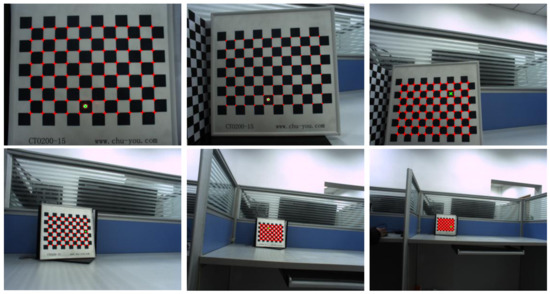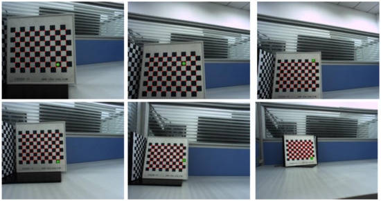 Ferrara et al. [35] mentioned that the position of the checkerboard has an effect on the accuracy of calibration. We supplemented a set of calibration data of checkerboard location on the edge of the image to verify the effect of the change of checkerboard location on the accuracy of the proposed method. The data are shown in Figure 11. The calibration results are shown in Table 6. When the image is in the edge position, the calibration results are basically consistent with the internal and external parameters obtained in Table 3 and Table 4, and the re-projection errors of the internal and external parameters are slightly increased, but the difference is small. It therefore shown that the method proposed in this paper is also applicable when the collected data lie on the edge of the image.