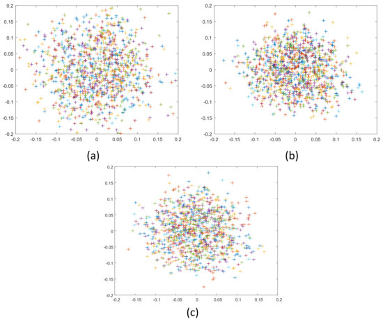 Re-projection error distribution for different images marked as different colors: (a) Zhang’s method [21]; (b) proposed method; (c) Li’s method [30].