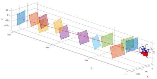 In the case of obtaining the parameters outside the target, the spatial coordinate of the laser spot in the camera coordinate system can be found by solving the known plane equation in the direction obtained by connecting the ray and the target from the camera optical center to the ideal image point coordinate . Moving the calibration board along the laser direction, the spatial position of laser spot can be obtained at different distances after multiple acquisitions. By processing the data, the laser beam can be straight in the camera coordinate system.