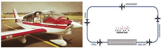 Left—ISAE-SUPAERO DR400 aircraft at Lasbordes airfield. Right—Experimental scenario: the pilots had to perform two traffic patterns (low and high load) along with an auditory oddball task.