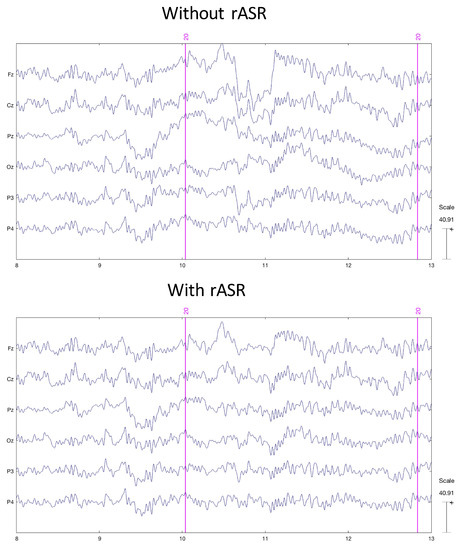 Up—Sample of EEG data before rASR processing for one subject. Sample of the same EEG data after rASR processing.