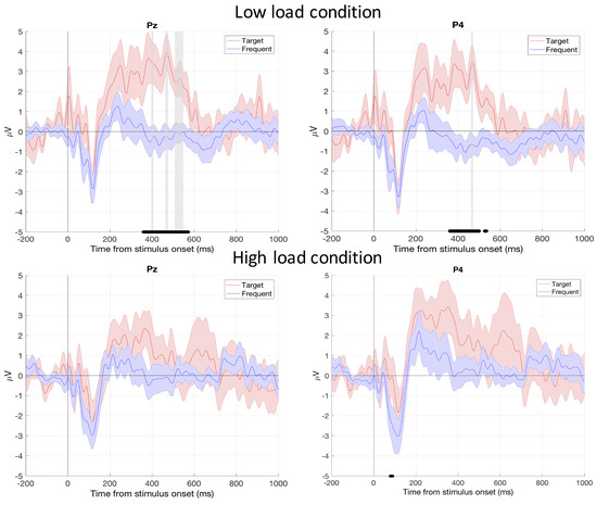 Grand averaged waveforms of the ERPs for parietal electrodes with standard error (shapes). The black lines on the x axis specify the time range when the target sound-related and the frequent sound-related ERP amplitudes were significantly different (p < 0.01). Up: low load condition. Down: high load condition. The vertical grey bars indicate when the P300 amplitude on the auditory target was statistically higher in the low load compared to the high load condition (p < 0.001). P300 considered time window was [350 600] ms.