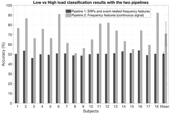 As regards the estimation of the mental workload using ERPs and event related frequency features, the mean accuracy was 50.4% (SD: 1.8) when using the ERP features only, 63.1% (SD: 9.5) when using the event related frequency features and was 50.4% (SD: 1.8) when combining the ERP and the event related frequency features (see Figure 5). As regards the estimation of the mental workload using the frequency features computed over the continuous signal, the mean classification accuracy reached 70.8% (SD: 12.5)—see Figure 5. Table 1 summarizes the classification results for the different pipelines and features.