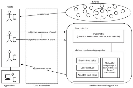 The proposed method for computing the trustworthiness of users’ contributions mitigates their possible misinterpretations. The method does not require the explicit involvement of the participants, except sharing assessment of the events. These are stored in a trust matrix , held by the mobile crowdsensing platform that collects user contributions. A user’s sharing of subjective values about the events requires their active involvement on the mobile application level, while contributing objective values of the events uses the opportunistic sensing approach with no or minimal user involvement.