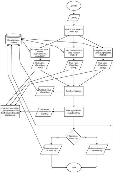- Thirdly, to provide a baseline for comparing methods, simulation tool also implements a calculation of a trust value of an event without considering the trustworthiness of the data (denoted as W/O).In this case, the event’s trust value is computed as an average value of all subjective assessments of the event previously reported by users, as defined in Equation (1).