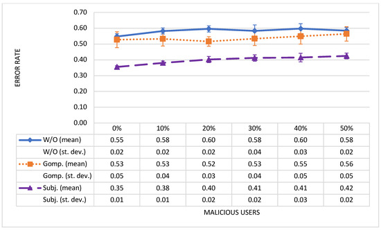 We repeated each configuration 100 times and computed the average error rate for each simulation configuration. The mean value and Standard Deviation for the error rate calculated after 100 repetitions of each simulation configuration are presented in Figure 4.