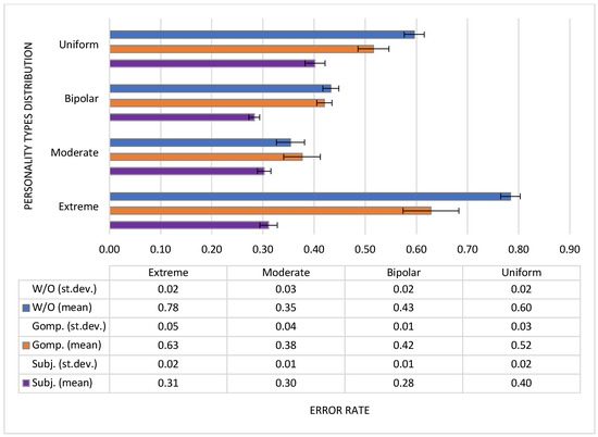 Mean value and Standard Deviation for error rate achieved with different methods for simulation configurations with different distributions of personality types.