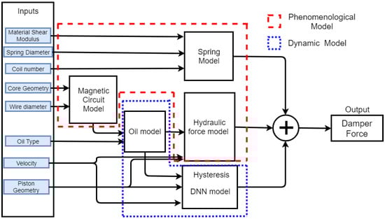 In this paper, a novel modeling methodology that combines first-principles modeling and non-parametric modeling techniques to represent the MR damper is presented. First-principle models are used to model the spring and the magnetic circuit. From properties of the magnetorheological fluid, a parametric fluid model is obtained. Hydraulic force of the damper is modeled using a hybrid model, the viscous component of the force is modeled via a first-principles model, and the magnetic component of the hydraulic force and hysteresis are modeled by a nonparametric model through deep learning [,]. The main rationale for the use of deep neural networks [] stems from the recognition that shallow neural networks are well suited to model a specific MR damper. However, in this work, it is not from a particular MR damper whose model is to be obtained, but from a family of MR dampers.