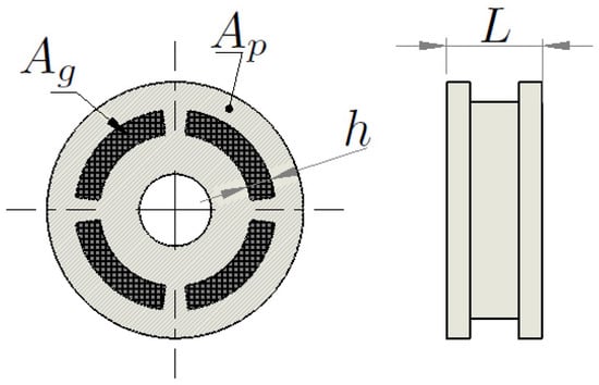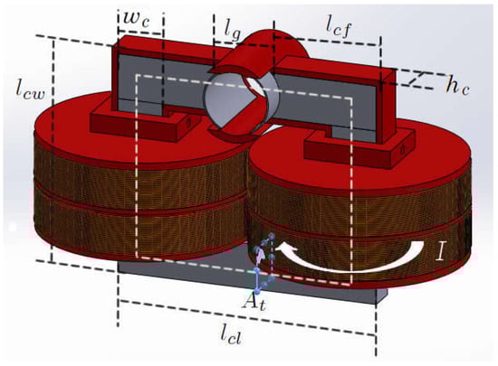 In a magnetic circuit, the magnetic field must overcome the material’s reluctance, which must be defined for each segment of the different materials in the magnetic circuit. The core material and air gap reluctances are given by Equations (4) and (5), respectively, where is the core permeability coefficient and is the air permeability coefficient.
