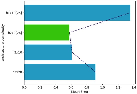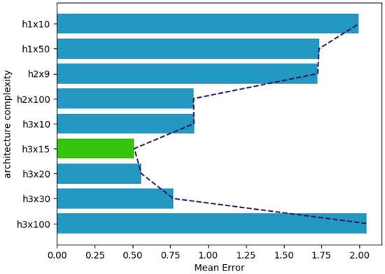 Most existing methodologies determine the number of hidden layers and neurons through a trial and error rule []. In this case, a grid search was selected [] to find a suitable network structure. As the starting point, the architectures that have been used to model a single magnetorheological damper were selected [,] and an analysis of the literature architectures with the same conditions considering exclusively one magnetorheological configuration was performed. The results of these architectures are shown in Figure 8, where it can be seen that the best performance is obtained by a shallow architecture with two hidden layers of nine neurons each (h2x9).