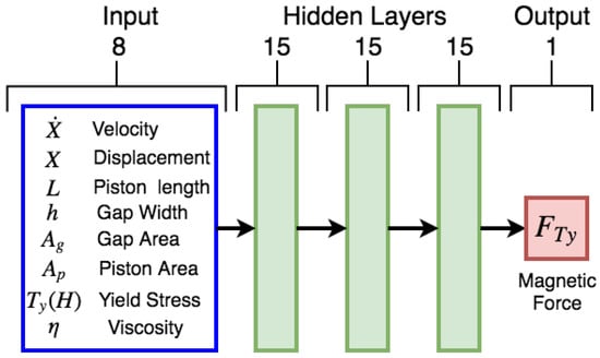 The first step is to define the inputs and outputs of the deep neural network from the problem statement. In this case, the output was fixed as the magnetorheological force component of the damper , and the inputs were chosen to be the design parameters directly related to the magnetic force performance and the physical variables that determine its behavior. Physical parameters of the damper that directly impact on the hysteresis behavior are piston length L, gap width h, gap area , and piston area ; the parameters that describe the oil performance are viscosity and yield stress ; and the physical parameters that impact the damper functionality are piston velocity and displacement x.
