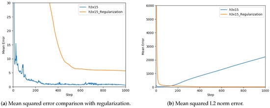 After selecting a network architecture, the need to use regularization techniques was analyzed, thus the performance of the network using the L2 norm [] was tested. In Figure 11a, the comparison between the performance of the network with regularization is shown. The use of L2 norm has the objective of reducing weights, shown in Figure 11b, and thus making the network more robust to losing any individual connection in the network. In this case, the regularization deteriorated the performance of the model, thus it was not appropriate to use it for training.