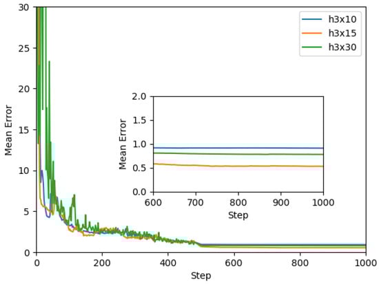 The model was trained for all proposed architectures discussed in the previous section. In Figure 12, a graph of the mean squared error vs. epoch of the best three models is presented. It was observed that the most complex architecture (h3x30) presented a noisier error graph and stopped learning with a larger final error than the other architectures. In comparison, the smallest architecture (h3x10) had little noise during its training but it stopped learning with the largest final error. The best model was the h3x15 architecture with a complexity between the other two models and its final error was the smallest one. Noise monitoring during the training process was very helpful in determining what changes should be made to the architecture to improve its behavior.