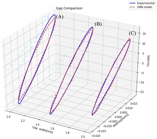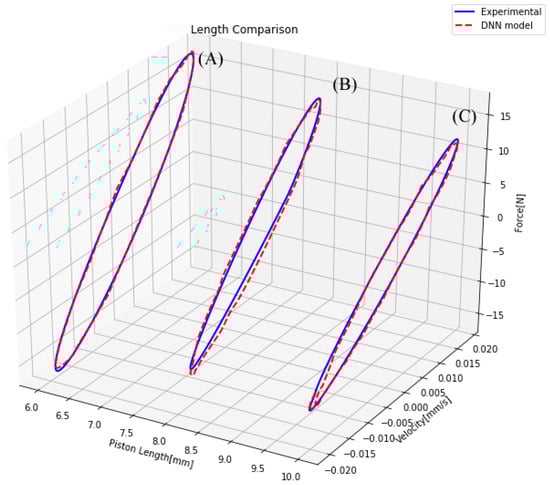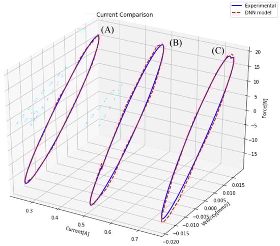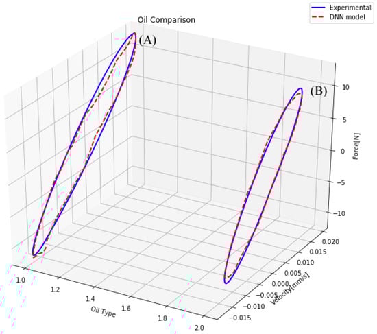 The second factor considered was the oil type design parameter. It worked as a selector since only one indicator number was changed. However, it radically changed the behavior of the magnetorheological damper. This design parameter was particularly challenging to model because a small change in an input drastically changed the behavior of the damper. To analyze if the model could represent a change in the oil type, a comparison of the same shock absorber filled with two different oils is shown in Figure 15. Considering the difficulty of modeling the oil change, the model presented an L-infinity norm error of 1 Newton, as shown in Figure 15A. This difference between the DNN model and real data could be explained by the noise present in the training measures, mainly the noise generated by the variation in the fluid volume during the multiple tests.