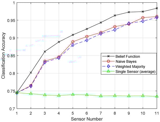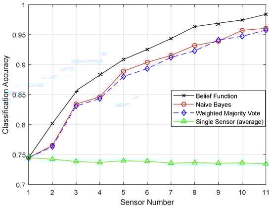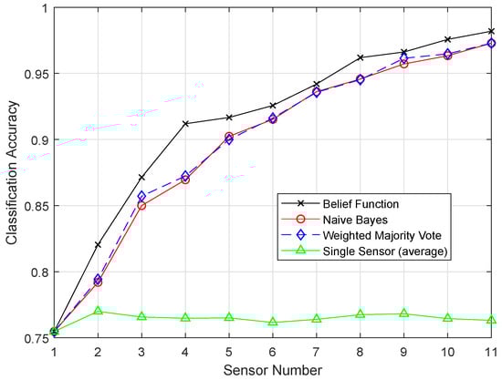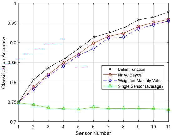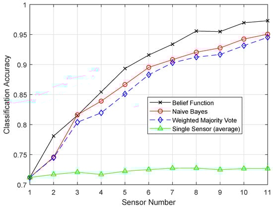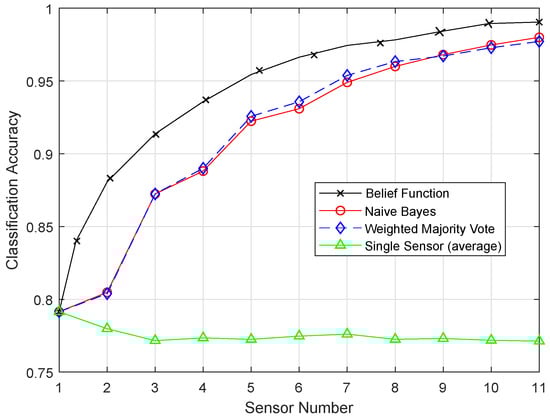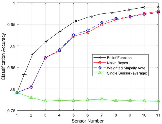 where is the classification accuracy of sensor . Apparently, a sensor with higher accuracy will be assigned a larger weight. This rule always performs better than the simple majority voting rule.