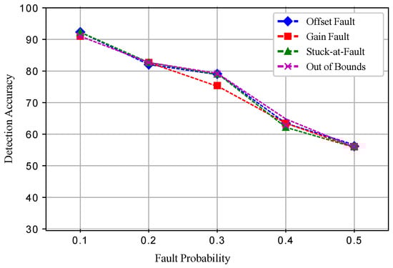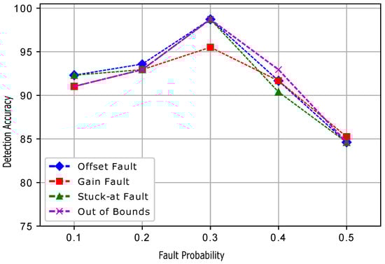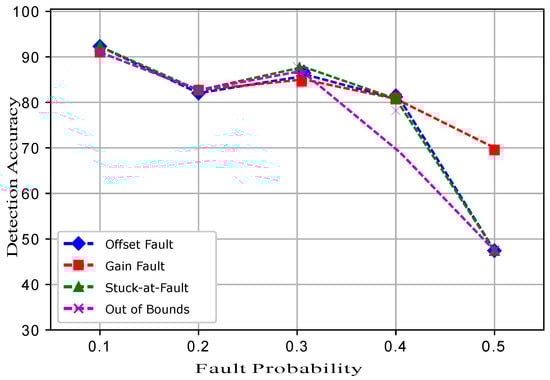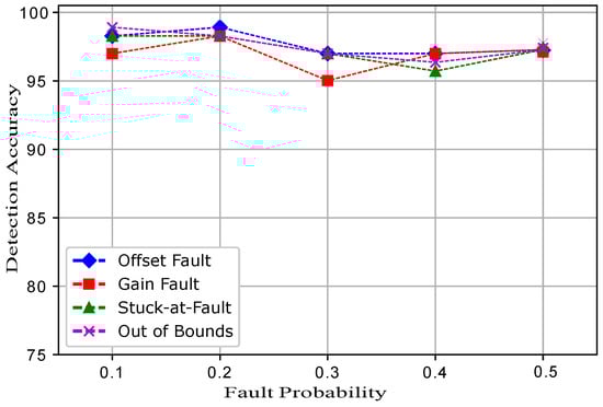 Figure 16 shows the detection accuracies of ERELM. The trend in Figure 16 shows that at only a 0.3 fault probability, the DA of RELM for the gain fault was 95%, and all the other faults showed the trend with a high accuracy of 97%. This indicates that between a 0.1 and a 0.2 fault probability, the DA was at 98%. The gain fault showed a different trend in the DA because in the equation of the gain fault, there was a constant multiplied with every reading. In the case of other faults, a constant was added, which had little impact on the detection accuracies of the classifiers. ERELM showed better results compared to EELM, ESVM, and EKNN and showed the highest DA. This is because the gains of RELM were transferred to the ERELM for training purposes in order to achieve a high accuracy. Weights in the output layer were calculated through the Moore–Penrose generalized inverse method.