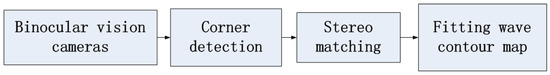 We use binocular cameras to measure the wave height and reconstruct the 3D free surface. To enrich the wave texture, the designed pattern is projected on the water surface. Finally, experiments prove that the proposed measurement approach is effective. The proposed measurement system consists of the following parts: the binocular camera measurement system works externally and is triggered by a signal generator to synchronously capture left and right images. Then, the proposed stereo matching algorithm extracts and matches the features of the left and right images. When drawing the contour map, the camera calibration results, including the fundamental, translation and rotation matrices, are used to calculate the wave height, shown in Figure 1.