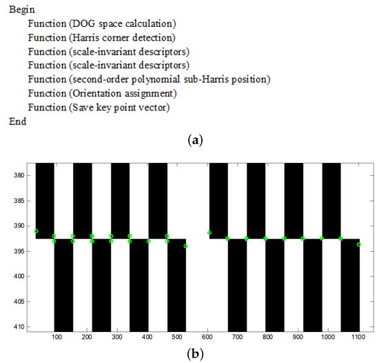 The flowchart and the simulation result. (a) the pseudo-code of improved SIFT features extraction; (b) to the left of the dotted line is an example of Harris corner detection, whereas an example of sub-pixel Harris corner detection is shown to the right.
