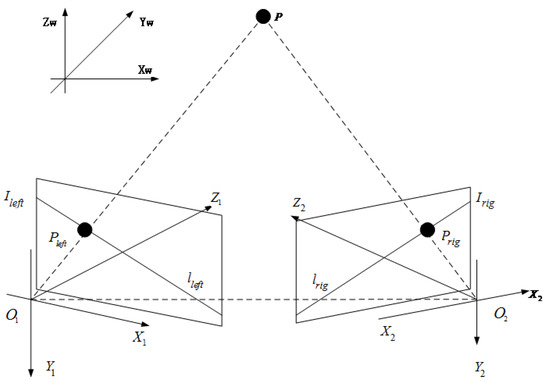 In this section, a bi-directional matching algorithm is introduced into the SIFT algorithm to decrease the mismatch rate and computation time. In the matching component of the original SIFT algorithm, the Euclidean distance between each corner in the left image and each corner in the right image is calculated, thereby representing a type of two-dimensional searching. However, the binocular camera method can change this process to a one-dimensional search using epipolar constraints (14), shown in Figure 3. In this paper, we propose a bi-directional epipolar constraint. Suppose P is a point in space; this point is imaged by the left camera as and by the right camera as . Therefore, and are a pair of correctly matched corners. and denote the image planes of the left and right cameras, respectively. The epipolar line is defined as follows: