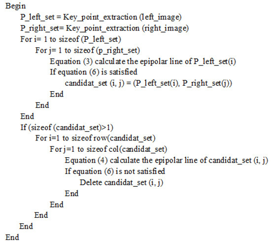where is the matching point. Generally, in the candidate set, more than one key point is always satisfied with Equation (6). Then, each of these key points calculates an epipolar line on the left image using Equation (4). Equation (6) calculates the distances between the and these epipolar lines. It must be only in the epiploar line of . The other pairs are deleted. The pseudo-code of bi-direction epipolar line is shown in Figure 4.