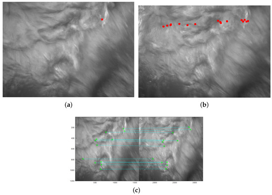 Figure 5 presents an example of the proposed matching algorithm. Figure 5a shows an arbitrary corner in the left image. There are 14 candidate corners in Figure 5b after applying the epipolar constraint due to the one-to-many matching phenomenon. When the bi-directional epipolar constraint is used, a one-to-one match between the left image and right image can be achieved, as shown in Figure 5c. To describe the matched result clearly, the left image and right image are combined and shown in Figure 5c. The horizontal and vertical axis represents the pixel number, and the captured image size is 1628 × 1236. The bi-directional epipolar constraint finds 12 one-to-one match pairs in total.