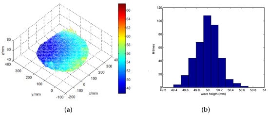 The 3D reconstruction of the calm water surface. (a) the measured three dimensional wave; (b) the statistics histogram of calm water wave height.