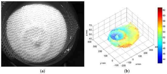 The three-dimensional calm water surface is shown in Figure 9a. The x-axis represents the horizontal distance to the left camera, and the y-axis represents the vertical distance, while the z-axis shows the wave height. The statistics histogram of 400 measurements is shown in Figure 9b, therefore the mean height of calm water is 50 mm. Figure 10a shows the original wave images captured by the binocular cameras. The micro-scale waves generated by the free-falling object are easily read from the images. On the images, we can easily discern a two-level wave; in addition to the centre layer, there is another ripple outside it. In this small container, the wave metre does not work well because of reflected waves. The three-dimensional wave height surface is shown in Figure 10b, which clearly represents the actual wave; even the reflected wave near the edge is also described in detail. The experiments with a calm water surface and micro-scale wave height measurement prove that the binocular camera measurement system can accurately measure the wave height with an absolute error of approximately 2 mm. When measuring the wave height, some influencing factors must be considered. First, in the experiment, because of transformation errors among the different coordinates, the results represent an incline in the detected height of the calm water wave, which is processed as a fixed system error. In sequencing wave height detection, calm water is used as the standard reference plane to increase the detection accuracy. Second, the intensity of the illumination is closely related to the accuracy of the wave height measurement. When the intensity value is excessively high, the wave height cannot be measured where a bright spot is generated. If the intensity value is too low, the entire image will be dark, and the wave height cannot be measured.