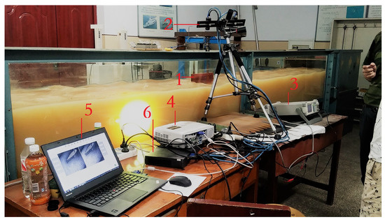 (3) Based on the projection of a regular pattern: in 2008, Cochard [25] proposed an algorithm based on a stipple projection and applied it to acquire free wave measurements of overflow due to the breakage of a dam. Their method projects a deformed stipple onto the surface to reconstruct the free surface. To accurately record the change in the waveform, their paper explored a new system including a digital camera and synchronous projector that could measure an area of 1.8 × 1.1 m2. However, when the area of free surface is bigger, the edge of the projection pattern became obscure. The paper designs an irregular pattern to resolve this problem. In 2009, Cobelli [26] proposed an optical profile measurement technique that could measure the free surface deformation at each instant. The system consisted of a high-resolution video projection and a digital camera. The phase diagram was generated by calculating the difference between the deformed stripe pattern and the reference pattern. Compared with other methods, the advantage of the system was that it offered contactless measurements over large-scale areas; moreover, the measurement and analysis system could measure the free surface deformation with 6 × 106 sample points over a sampling area of 450 × 300 mm2 with a vertical resolution of 0.2 mm.