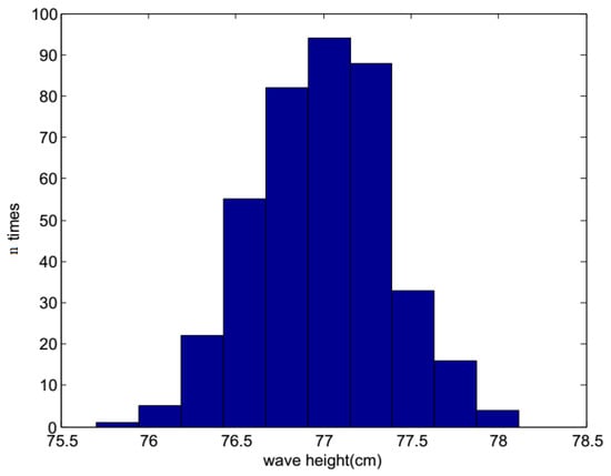 Figure 12 shows the original images of the waves in the tank, and a pattern is clearly observed. Around the airfoil shape, some micro-scale ripples can be seen. The height ruler is fixed to the side of the airfoil shape, thereby forming a stable standard measurement plane together with the upper surface of the airfoil. The contour map and three-dimensional wave height figure are shown in Figure 13. In Figure 13a, the upper part is the airfoil shape, while the groove in the middle denotes the position of the airfoil support. The bottom part represents the micro-scale wave; in the image, we can read the peaks and troughs, which are not easily recognized in the original wave images. Figure 14a presents the contour map, on which the numbers show the wave height of the discrete scatters. The upper surface height (from the upper surface of airfoil shape to the bottom of the tank is 60 cm) is set as 0; therefore, the wave height value is represented as a negative value. The tank is so small that the wave meter cannot stabilize at a certain value because of the occurrence of strong reflected waves. Although no wave height meter can sufficiently measure the dynamic wave height, this study uses the method used in a PhD thesis [26], in which a Vernier caliper was introduced as the standard measurement, for the sake of comparison with the proposed algorithm, which is shown in Figure 14b. The statistics histogram of 400 measurements of the point A is 77 cm, shown in Figure 15. Because the upper surface height is 60 cm, the wave height of point A is 12 cm, which is in accordance with Figure 13b.