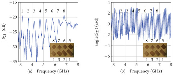 Response of the chipless tag in cross polarization [18] in (a) magnitude and (b) phase as a function of the frequency.