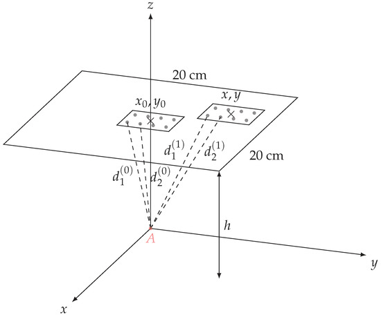 Localization based on chipless tags has already been investigated in the literature. The classical method used in [11,12,13,14] requires at least three different antennas and estimates the distance between the tag and the known antenna positions with the round-trip time-of-flight. Tri-lateration algorithm is then used to recover the position of a tag from the estimated distances. The classical setup configuration is presented in Figure 1a. All these approaches use at least 3 different antennas ( in Figure 1a) and have been focused on the structural mode of the tag (i.e., the early part response of the backscattered wave) to determine the tag’s position. These approaches could easily be extended to localize the tag in the 3D space but remain sensitive to unknown objects present in the environment. In [15], the author has used the phase of the reflected signal to measure distance variations. This method provides a better robustness against the presence of unknown or moving objects in the environment since antenna mode of the response is used, however, displacements are measured along a single direction. Moreover, in [16] authors have determined the location of a chipless tag using the change of the magnitude of the backscattered signal using the information of each of the tag’s scatterer. This latter method provides an absolute positioning on a single plane but suffers from a relatively low accuracy. Finally, in [10], authors use phase measurements to localize the tag in a single plan (at a single height) and in a relatively limited area. The approach described in this paper uses the same analytical model than [10,15] but introduces a robust technique to localize the tag at different heights and over a larger area.