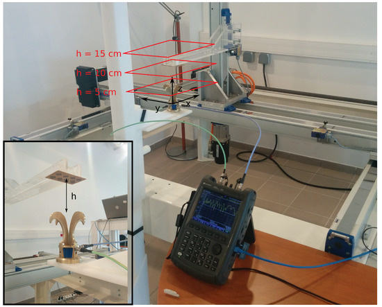 The measurement bench used in our study for chipless tag localization is presented Figure 5. The chipless tag is placed at the end of a plastic arm which can move along the three dimensions x, y and z. The Satimo QH2000, which is two-port antenna used to measure the signal in both vertical and horizontal polarization, is fixed and located under the tag. This antenna is connected to port 1 and 2 of the VNA. Cross-polarization response of the tag corresponds to the parameter and is acquired over the bandwidth 2.8–8 GHz. Response of the tag is measured and stored for each position in a square of 20 cm side (with a 1 cm step along x and y) above the antenna and for three different heights h which are 5 cm, 10 cm and 15 cm (see Figure 5). All the measurements has been realized in real environment.