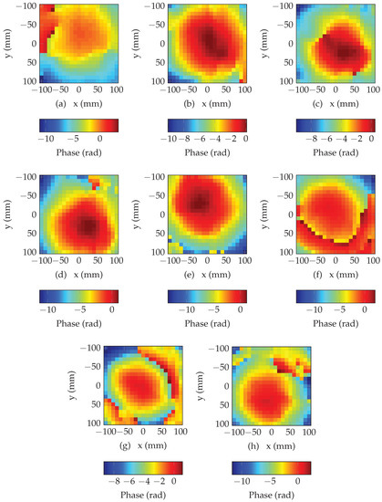 Unwrapped phase as a function of the position on the plan, (a) for the 1st (3.19 GHz), (b) for the 2nd (3.68 GHz), (c) for the 3td (4.18 GHz), (d) for the 4th (4.70 GHz), (e) for the 5th (5.22 GHz), (f) for the 6th (5.79 GHz), (g) for the 7th (6.33 GHz), (h) for the 8th resonant frequency (6.78 GHz) for the reference position , and at a height of cm from the antenna.