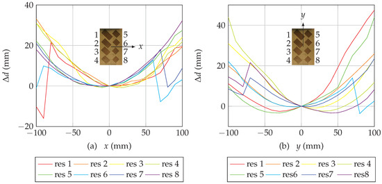 Estimation of the distance variations for the 8 resonators as a function of a displacement for a reference position located at , and at a height of cm along (a) x and (b) y.