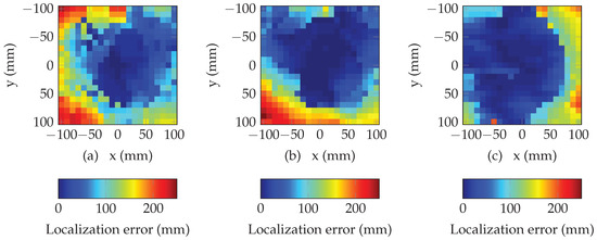 Localization error in mm of the multi-lateration algorithm using 8 resonators for (a) cm, (b) cm and (c) cm.